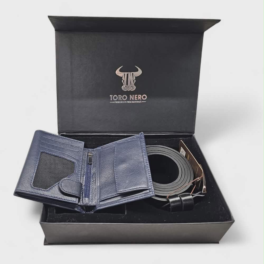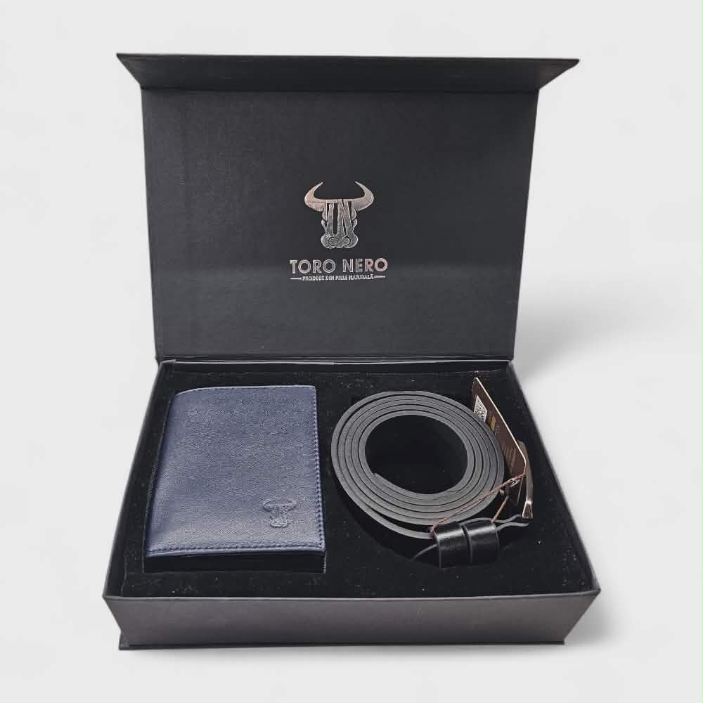 Комплект тъмносиньо портмоне с черен колан TORO NERO