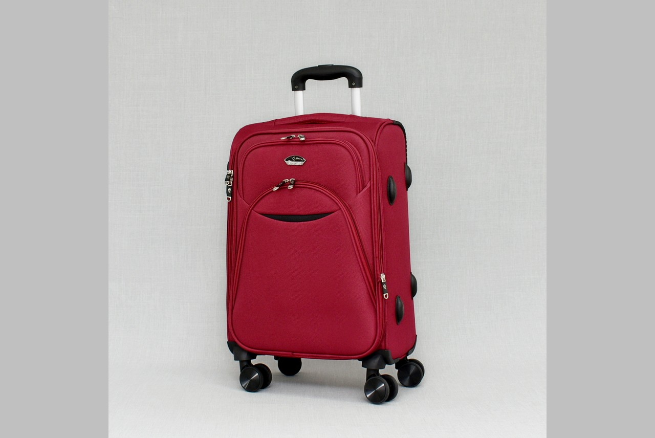 Малък текстилен куфар с четири колела в бордо