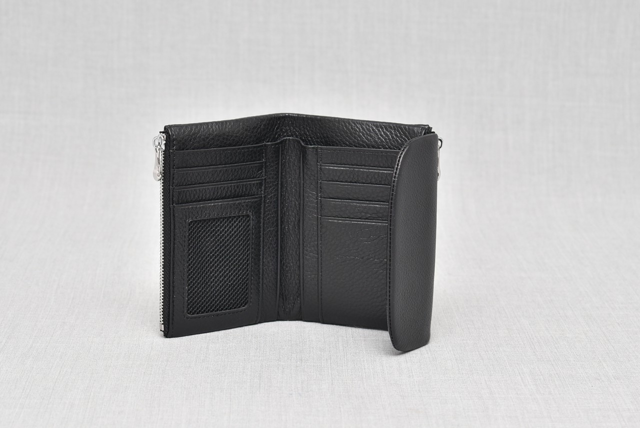 Арт. номер: 056Елегантно дамско портмоне от естествена кожа с функционален дизайн – едно отделение за банкноти, отделения за карти и визитки и два отделни джоба с цип за монети. Мек магнит осигурява удобно затваряне. Идва в стилна луксозна кутия, подходяща за подаряване.