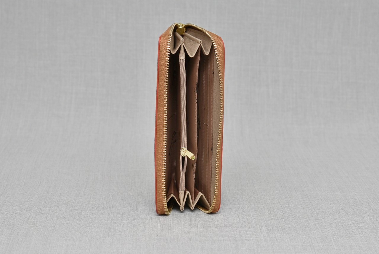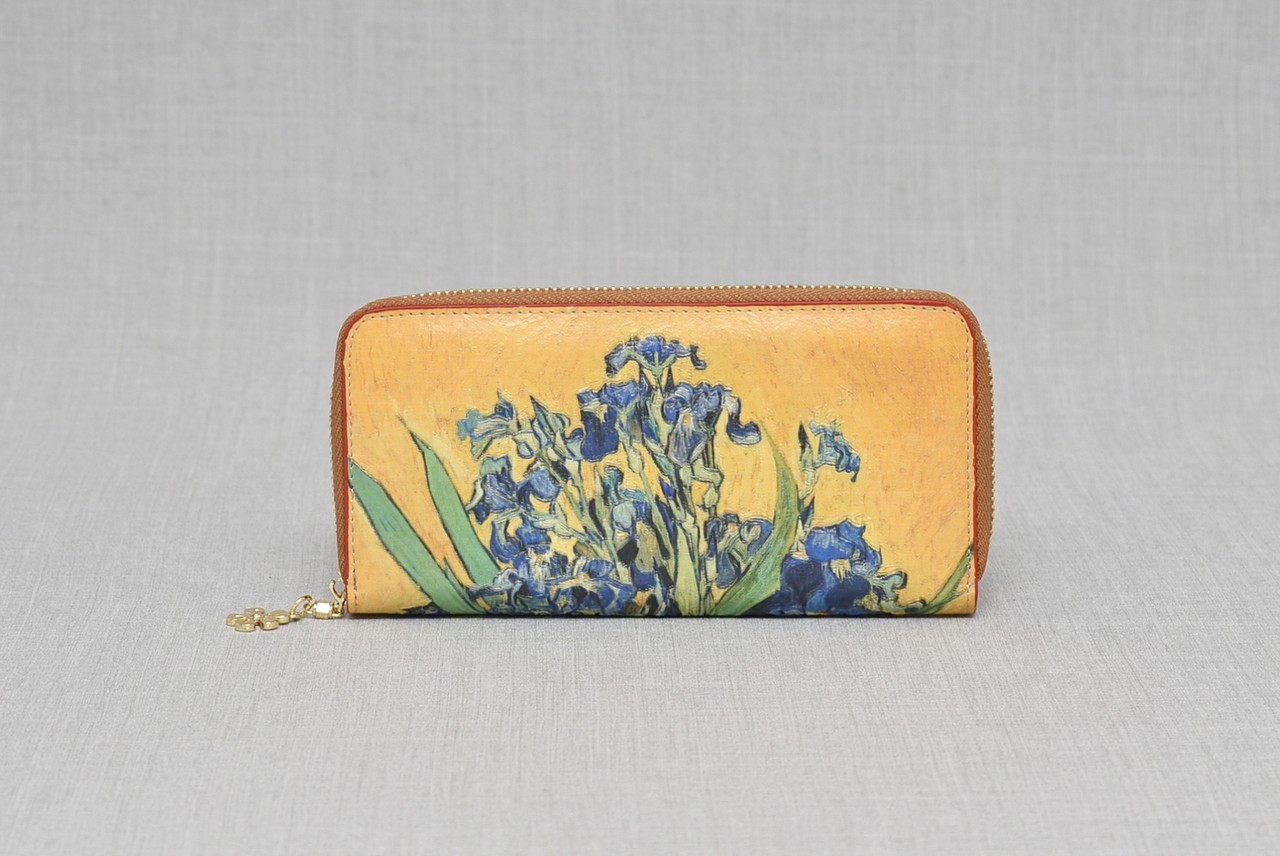 Арт. номер: 22042-1Елегантно дамско портмоне от естествена кожа с художествен десен. Затваря се сигурно с цип и разполага с две прегради за банкноти, отделен джоб с цип за монети и място за карти. Идеален избор за жената, която обича изтънчения стил и индивидуалния дизайн.