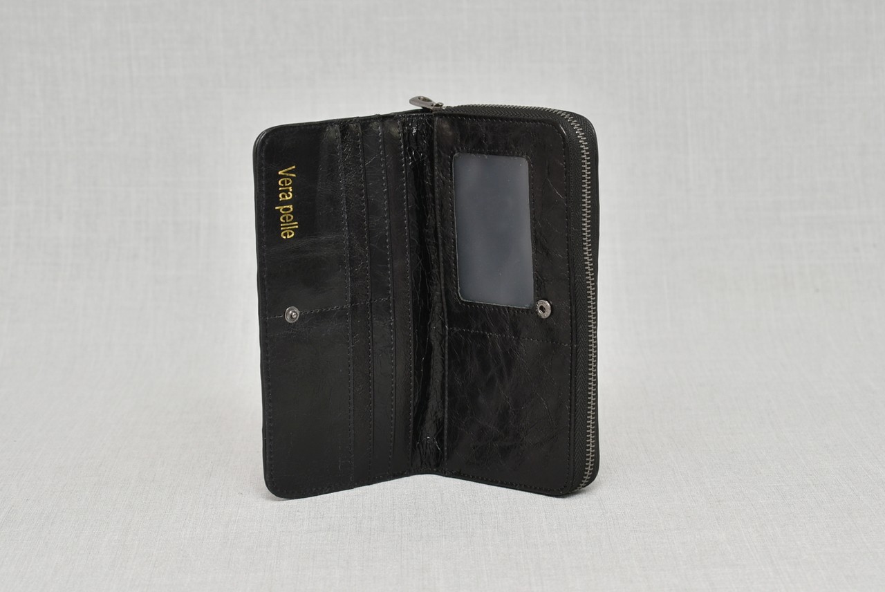Арт. номер: 606-5Дамско портмоне от естествена кожа, красиво и елегантно, със стилен черен дизайн. Разполага с две отделения: първото включва два удобни джоба с цип за монети и пространство за банкноти, а второто предлага подредено място за карти и се затваря сигурно с капса копче. Идва в луксозна подаръчна кутия, идеална за изискан подарък.