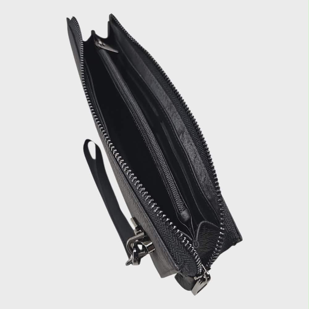Портмонето предлага изобилие от места за карти и визитки, осигурявайки удобен достъп и подреденост. От задната страна е добавена кожена дръжка за ръка, както и допълнителна дръжка, позволяваща портфейлът да се носи удобно на китката. Класическата визия и изчистеният дизайн го правят подходящ както за ежедневна употреба, така и за по-официални поводи.