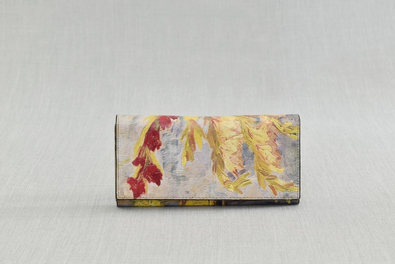 Арт. номер: 456-5Портмоне от естествена кожа с десен по мотиви от известни картини на Ван Гог. Стилен модел с капак, множество прегради за карти и визитки, няколко отделения за банкноти и джобове с цип. Артистично докосване към ежедневието.